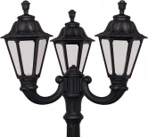 Парковый фонарь FUMAGALLI среднего размера серии RUT, модель TABOR OFIR/RUT 3L. Парковый фонарь с 3 светильниками, на консолях OFIR среднего размера, установленных на классическом столбе TABOR высотой 3,0 м (+высота фонарей на кронштейнах). Изготовлены в Италии, по уникальным технологиям "FUMATECH" из современного композитного полимера RESIN. Этот материал в 5 раз прочнее металла, не ржавеет, не окисляется, не выгорает на солнце, его не нужно красить. Все светильники пыле-влаго защищены по стандарту IP55 (Пылезащищенные, защита от водяных струй с любого направления). Рассеиватель выполнен из антивандального, не мутнеющего и не горючего PMMA (ПолиМетилМетаАкрилат). Срок службы светильника - не менее 20 лет. Температура использования от -60 до +90. В серии RUT есть садовые фонари в настенном (OFIR/RUT, MIRRA/RUT) подвесном (SICHEM/RUT) и наземном исполнении (IAFAET.R/RUT, ALOE.R/RUT, ARTU/RUT, GIGI/RUT, RICU/RUT, NEBO/OFIR/RUT 1L, NEBO/OFIR/ANNA 2L, TABOR/ADAM/RUT 3L) со столбами разной высоты, с разным количеством и конфигурацией голов. Консоли настенных фонарей и кронштейны светильников на столбах освещения могут устанавливаться в положение вверх и вниз. Столбы выше 150 см имеют в основе мощную стальную трубу с двойной оцинковкой. При заказе требуется выбрать цвет корпуса, цвет плафона. По стилю и дизайну серия уличных светильников RUT похожа на светильники большого размера серии NOEMI и малого размера серии ANNA . По размеру относится к средним парковым светильникам как серия CEFA и GLOBE 300.