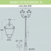 Парковый фонарь FUMAGALLI большого размера серии SIMON, модель NEBO OFIR/SIMON 2L. Парковый фонарь с 2 светильниками большого размера, на консолях OFIR среднего размера, установленных на классическом столбе NEBO высотой 2,5 м (+высота фонарей на кронштейнах). Изготовлены в Италии, по уникальным технологиям "FUMATECH" из современного композитного полимера RESIN. Этот материал в 5 раз прочнее металла, не ржавеет, не окисляется, не выгорает на солнце, его не нужно красить. Все светильники пыле-влаго защищены по стандарту IP55 (Пылезащищенные, защита от водяных струй с любого направления). Рассеиватель выполнен из антивандального, не мутнеющего и не горючего PMMA (ПолиМетилМетаАкрилат). Срок службы светильника - не менее 20 лет. Температура использования от -60 до +90. В серии SIMON есть садовые фонари в настенном (OFIR/SIMON, MIRRA/SIMON) подвесном (SICHEM/SIMON) и наземном исполнении (IAFAET.R/SIMON, ALOE.R/SIMON, ARTU/SIMON, GIGI/SIMON, RICU/SIMON, NEBO/OFIR/SIMON 1L, NEBO/OFIR/ANNA 2L, TABOR/ADAM/SIMON 3L) со столбами разной высоты, с разным количеством и конфигурацией голов. Консоли настенных фонарей и кронштейны светильников на столбах освещения могут устанавливаться в положение вверх и вниз. Столбы выше 150 см имеют в основе мощную стальную трубу с двойной оцинковкой. При заказе требуется выбрать цвет корпуса, цвет плафона и тип патрона (Е-27 или LED GX-53). Возможен светодиодный вариант. По стилю и дизайну серия уличных светильников SIMON похожа на светильники среднего размера серии CEFA. По размеру относится к большим парковым светильникам как серия NOEMI и GLOBE 400.