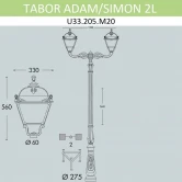 Парковый фонарь FUMAGALLI большого размера серии SIMON, модель TABOR ADAM/SIMON 2L. Парковый фонарь с 2 светильниками большого размера, на консолях ADAM большого размера, установленных на классическом столбе TABOR высотой 3,0 м (+высота фонарей на кронштейнах). Изготовлены в Италии, по уникальным технологиям "FUMATECH" из современного композитного полимера RESIN. Этот материал в 5 раз прочнее металла, не ржавеет, не окисляется, не выгорает на солнце, его не нужно красить. Все светильники пыле-влаго защищены по стандарту IP55 (Пылезащищенные, защита от водяных струй с любого направления). Рассеиватель выполнен из антивандального, не мутнеющего и не горючего PMMA (ПолиМетилМетаАкрилат). Срок службы светильника - не менее 20 лет. Температура использования от -60 до +90. В серии SIMON есть садовые фонари в настенном (OFIR/SIMON, MIRRA/SIMON) подвесном (SICHEM/SIMON) и наземном исполнении (IAFAET.R/SIMON, ALOE.R/SIMON, ARTU/SIMON, GIGI/SIMON, RICU/SIMON, NEBO/OFIR/SIMON 1L, NEBO/OFIR/ANNA 2L, TABOR/ADAM/SIMON 3L) со столбами разной высоты, с разным количеством и конфигурацией голов. Консоли настенных фонарей и кронштейны светильников на столбах освещения могут устанавливаться в положение вверх и вниз. Столбы выше 150 см имеют в основе мощную стальную трубу с двойной оцинковкой. При заказе требуется выбрать цвет корпуса, цвет плафона и тип патрона (Е-27 или LED GX-53). Возможен светодиодный вариант. По стилю и дизайну серия уличных светильников SIMON похожа на светильники среднего размера серии CEFA. По размеру относится к большим парковым светильникам как серия NOEMI и GLOBE 400.