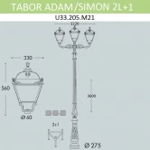 Парковый фонарь FUMAGALLI большого размера серии SIMON, модель TABOR ADAM/SIMON 2L+1. Парковый фонарь с 2 светильниками большого размера, на консолях ADAM большого размера, плюс 1 венчающий светильник, установленные на классическом столбе TABOR высотой 3,0 м (+высота фонарей на кронштейнах). Изготовлены в Италии, по уникальным технологиям "FUMATECH" из современного композитного полимера RESIN. Этот материал в 5 раз прочнее металла, не ржавеет, не окисляется, не выгорает на солнце, его не нужно красить. Все светильники пыле-влаго защищены по стандарту IP55 (Пылезащищенные, защита от водяных струй с любого направления). Рассеиватель выполнен из антивандального, не мутнеющего и не горючего PMMA (ПолиМетилМетаАкрилат). Срок службы светильника - не менее 20 лет. Температура использования от -60 до +90. В серии SIMON есть садовые фонари в настенном (OFIR/SIMON, MIRRA/SIMON) подвесном (SICHEM/SIMON) и наземном исполнении (IAFAET.R/SIMON, ALOE.R/SIMON, ARTU/SIMON, GIGI/SIMON, RICU/SIMON, NEBO/OFIR/SIMON 1L, NEBO/OFIR/ANNA 2L, TABOR/ADAM/SIMON 3L) со столбами разной высоты, с разным количеством и конфигурацией голов. Консоли настенных фонарей и кронштейны светильников на столбах освещения могут устанавливаться в положение вверх и вниз. Столбы выше 150 см имеют в основе мощную стальную трубу с двойной оцинковкой. При заказе требуется выбрать цвет корпуса, цвет плафона и тип патрона (Е-27 или LED GX-53). Возможен светодиодный вариант. По стилю и дизайну серия уличных светильников SIMON похожа на светильники среднего размера серии CEFA. По размеру относится к большим парковым светильникам как серия NOEMI и GLOBE 400.