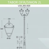 Парковый фонарь FUMAGALLI большого размера серии SIMON, модель TABOR OFIR/SIMON 2L. Парковый фонарь с 2 светильниками большого размера, на консолях OFIR среднего размера, установленных на классическом столбе TABOR высотой 3,0 м (+высота фонарей на кронштейнах). Изготовлены в Италии, по уникальным технологиям "FUMATECH" из современного композитного полимера RESIN. Этот материал в 5 раз прочнее металла, не ржавеет, не окисляется, не выгорает на солнце, его не нужно красить. Все светильники пыле-влаго защищены по стандарту IP55 (Пылезащищенные, защита от водяных струй с любого направления). Рассеиватель выполнен из антивандального, не мутнеющего и не горючего PMMA (ПолиМетилМетаАкрилат). Срок службы светильника - не менее 20 лет. Температура использования от -60 до +90. В серии SIMON есть садовые фонари в настенном (OFIR/SIMON, MIRRA/SIMON) подвесном (SICHEM/SIMON) и наземном исполнении (IAFAET.R/SIMON, ALOE.R/SIMON, ARTU/SIMON, GIGI/SIMON, RICU/SIMON, NEBO/OFIR/SIMON 1L, NEBO/OFIR/ANNA 2L, TABOR/ADAM/SIMON 3L) со столбами разной высоты, с разным количеством и конфигурацией голов. Консоли настенных фонарей и кронштейны светильников на столбах освещения могут устанавливаться в положение вверх и вниз. Столбы выше 150 см имеют в основе мощную стальную трубу с двойной оцинковкой. При заказе требуется выбрать цвет корпуса, цвет плафона и тип патрона (Е-27 или LED GX-53). Возможен светодиодный вариант. По стилю и дизайну серия уличных светильников SIMON похожа на светильники среднего размера серии CEFA. По размеру относится к большим парковым светильникам как серия NOEMI и GLOBE 400.