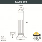 Садовый светильник-столбик FUMAGALLI серии SAURO, модель SAURO 800 - изготовлены в Италии. Используются для освещения парковых дорожек, газонов, парковок, набережных, как элементы ландшафтного и светового дизайна. Укомплектован цилиндрическим рассеивателем (рефлектором) белого цвета, который распределяет свет лампы и исключает эффект ослепления. Корпус изготовлен из современного вандалостойкого, негорючего полимера RESIN. Прочного, окрашенного в массе, не ржавеющего, не выгорающего на солнце, не проводящего электричество. Все светильники пыле-влаго защищены по стандарту IP55. Рассеиватель выполнен из толстого антивандального, не мутнеющего и не горючего PMMA (ПолиМетилМетаАкрилат). Срок службы светильника - не менее 20 лет, в течении которого парковый светильник не нужно красить и как либо обслуживать. Температура эксплуатации от -60 до +90. При заказе требуется выбрать цвет корпуса, цвет плафона и тип патрона. Серия SAURO включает в себя светильники высотой 0,50 метра, 0,80 метра, 1,1 метра, а так же уличный светильник MIRELLA с установкой на стену. Дополнительно можно использовать столбики- ограждения NARDO высотой 60 и 90 сантиметров. Между столбиков можно натягивать цепочку. Также светильник-столбик с цоколем Е27, может комплектоваться хромированным или белым рассеивателем на лампу. Закладные крепежные элементы паркового столба SAURO - в комплекте.