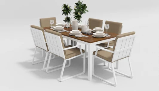 Материалы: всесезонный алюминий, ткань для улицы, тик. Цвет: каркас - белый / подушки - бежевые / столешница - тик. Комплектация и габариты: Стол 180 * 90 * 75 - 1 шт, Стул с подлокотниками 60 * 60 * 85 - 6 шт.