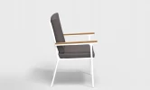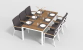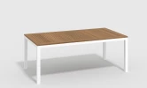 Материалы: всесезонный алюминий, ткань для улицы, тик. Цвет: каркас - белый / подушки - антрацит / столешница - тик. Комплектация и габариты: Стол 200 * 100 * 75 - 1 шт, Стул 57 * 60 * 86 - 6 шт.