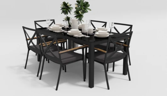 Материалы: всесезонный алюминий, ткань для улицы, закаленное стекло, тик. Цвет: каркас - темно-серый карбон / подушки - антрацит / столешница - черная глянцевая. Комплектация и габариты: Стол 180 * 90 * 76 - 1 шт, Стул 57 * 60 * 86 - 6 шт.