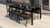 Материалы: всесезонный алюминий, ткань для улицы, закаленное стекло, тик. Цвет: каркас - темно-серый карбон / подушки - антрацит / столешница - черная глянцевая. Комплектация и габариты: Стол 220 * 100 * 76 - 1 шт, Стул 57 * 60 * 86 - 6 шт.