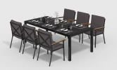 Материалы: всесезонный алюминий, ткань для улицы, закаленное стекло, тик. Цвет: каркас - темно-серый карбон /подушки - антрацит / столешница - черная глянцевая. Комплектация и габариты: Стол 220 * 100 * 76 - 1 шт, Стул 57 * 60 * 86 - 6 шт.