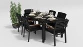 Материалы: всесезонный алюминий, ткань для улицы, закаленное стекло, тик. Цвет: каркас - темно-серый карбон / подушки - черные / столешница - черная глянцевая. Комплектация и габариты: Стол 180 * 90 * 76 - 1 шт, Стул 57 * 62 * 85 - 6 шт.