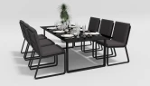Материалы: всесезонный алюминий, ткань для улицы, закаленное стекло. Цвет: каркас - темно-серый карбон / подушки - антрацит / столешница - черная глянцевая. Комплектация и габариты: Стол 220 * 105 * 75 - 1 шт, Стул без подлокотников 54 * 60 * 85 - 6 шт.