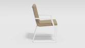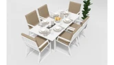 Материалы: всесезонный алюминий, ткань для улицы, закаленное стекло. Цвет: карка - белый / подушки - бежевые / столешница - белая глянцевая. Комплектация и габариты: Стол 180 * 90 * 75 - 1 шт, Стул с подлокотниками 60 * 60 * 85 - 6 шт.
