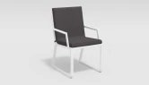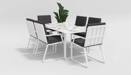 Материалы: всесезонный алюминий, ткань для улицы, закаленное стекло. Цвет: каркас - белый / подушки - антрацит / столешница - белая глянцевая. Комплектация и габариты: Стол 180 * 90 * 75 - 1 шт, Стул с подлокотниками 60 * 60 * 85 - 6 шт.
