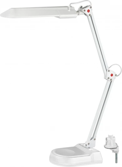 Светильник предназначен для использования с энергосберегающей лампой, лампа входит к комплект. Два варианта крепления в комплекте: основание, струбцина. Высота плафона регулируется двухсекционной сгибающейся стойкой.