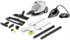 Предохранитель, Предохранительный клапан, Регулятор расхода пара, на рукоятке, Микроволоконная салфетка для пола 2 шт, Микроволоконная обтяжка для ручной насадки 1 шт, Порошковый антинакипин, Держатели для принадлежностей и возможность «парковки», Паровой шланг с пистолетом 2.3 м, Точечное сопло, Ручная насадка, Мощное сопло желтое, Круглая щетка черная 1 шт.Круглая щетка-большая, Паровой утюг EasyFinish, Насадка для пола EasyFix, Встроенный выключатель, Удлинительные трубки (2 × 0, 5 м), Накладка для чистки ковров