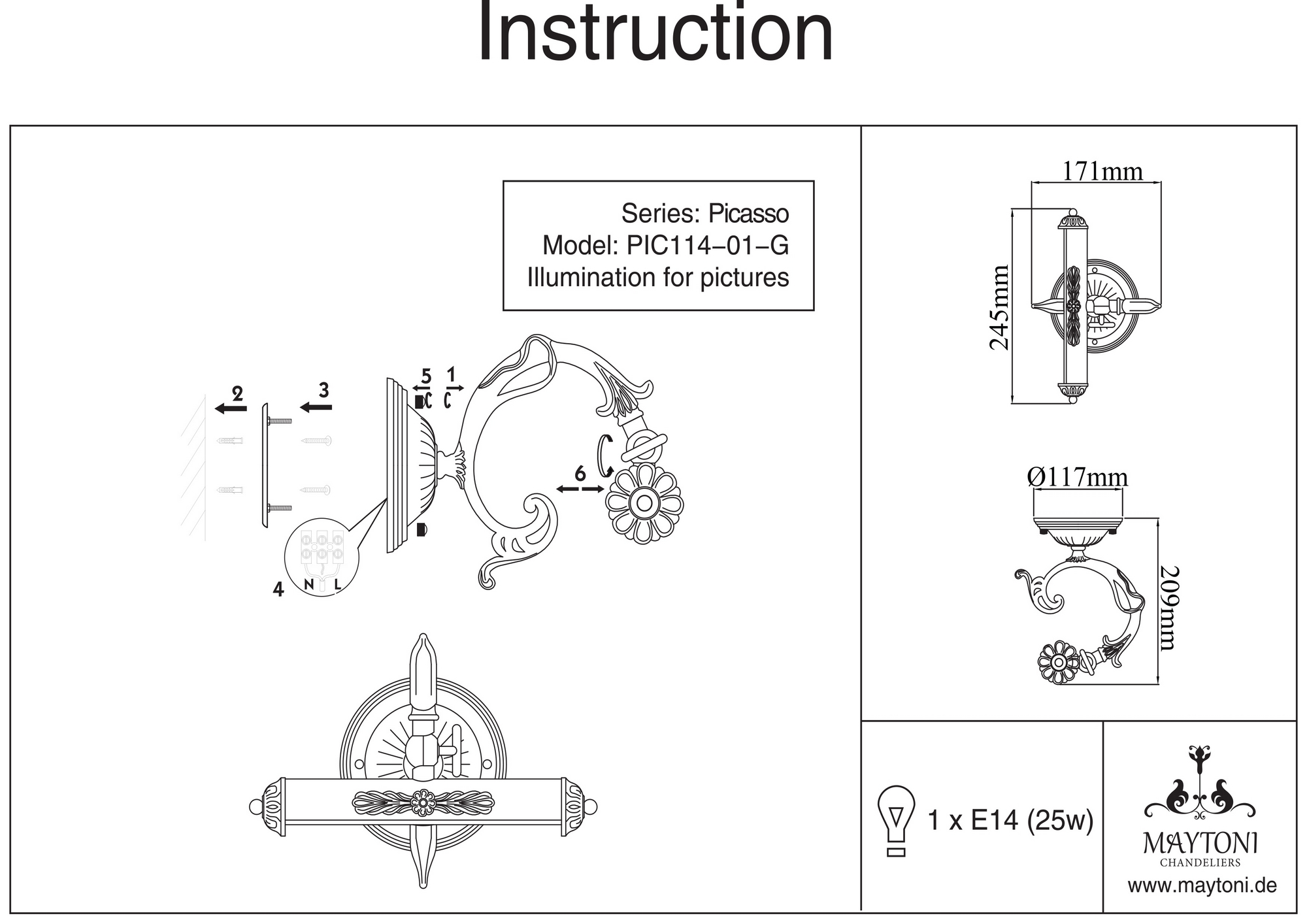 Подсветка для картин PIC114-01-G из серии Picasso от компании Maytoni отлично подойдет в качестве дополнительного источника света для прихожей и коридора, кабинета, выполненных в классическом стиле. Основной цвет модели - золото, материал арматуры - металл. Подсветка оснащена цоколем E14 и рассчитана на лампочку с мощностью 25W и напряжением 220V. Плафон направлен вниз, материал изготовления - металл. Светильник поддерживает подключение диммера. Подсветка устанавливается на монтажную пластину. Лучшая цена и условия доставки на Maytoni PIC114-01-G в интернет-магазине Fedomo.ru.