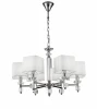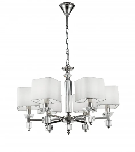 Люстра из металла цвета глянцевый никель с квадратными белыми абажурами из ткани. Декорирована одним крупным вертикальным и несколькими небольшими стеклянными элементами. 6хЕ14