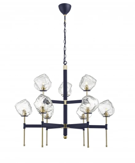 Двухярусная люстра из металла окрашенного в матовый синий цвет с золотыми элементами и плафонами в виде прозрачных глыб льда. D660mm, H850-2310mm, 9хG9
