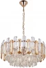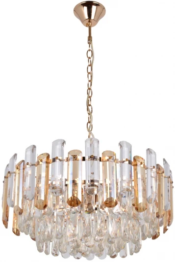 Металлическое основание светильника гальванизировано в цвет золота. Подвесная люстра декорирована крупным прозрачным хрусталем и хрусталем цвета шампань.