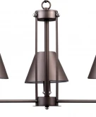 БАЙС. Основа люстры и плафонов - металл серого цвета с фактурной поверхностью. Геометрическая строгость в каждой детали. Центр люстры-металлические пластины, собранные в каркас, удерживающие лопасти основания. На лопастях уверенно расположились плафоны конусовидной формы.