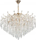 Металлическое основание потолочного светильника выполнено из металл и гальванизировано в золотой цвет. Светильник декорирован подвесками из фактурного прозрачного хрусталя в форме октагон и око. Дизайн-идея в каскаде хрусталя различного размера, формы и фактуры. Хрусталь преломляет световой поток, создавая красивую игру света. Большое количество хрусталя создает праздничное настроение и добавляет подвесному светильнику декоративности Регулируемая высота светильника за счет звеньев цепи.