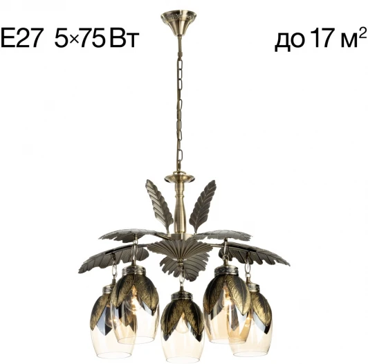 Корпус светильника металлический, декоративные элементы имеют оригинальный экзотический характер, что придает ей уникальный и неповторимый вид. Цвет темной состаренной бронзы идеально сочетается с плафонами из прозрачного стекла светло-янтарного оттенка, создавая гармоничное и стильное сочетание.