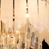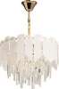 Металлическое основание светильника гальванизировано в цвет золота. Люстра декорирована пластинами из белого акрила неровной формы и прозрачным хрусталем вытянутой формы.