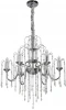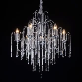 Металлическое основание светильника гальванизировано в цвет хрома. Люстра декорирована прозрачным хрусталем каплевидной формы и витыми элементами из сплава алюминия с лазерной насечкой.