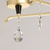 Металлическое основание подвесной люстры обработано по технологии порошкового окрашивания в цвет золота. Отдельные элементы основания окрашены в черный цвет. Люстра декорирована плафонами из прозрачного стекла оригинальной формы.