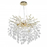 Основание подвесной люстры выполнено по технологии художественного литья из сплава алюминия с цинком и гальванизировано в цвет золота. Люстра декорирована подвесками из прозрачного хрусталя.