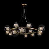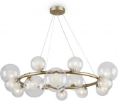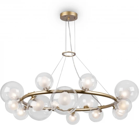 Создавая серию Duo, дизайнеры вдохновлялись стилистикой mid-century modern, в частности – «молекулярной» формой предметов. Арматура оттенка матового золота выполнена из металла, а двойные плафоны-сферы – из стекла. Внутренняя часть плафона – белого цвета, внешняя – прозрачная. Расположенные вдоль широкой окружности, они обеспечивают равномерное, яркое освещение. Визуальную легкость композиции подчеркивают тонкие, почти невидимые тросы – создается иллюзия трендового «парящего» света. Две подвесные люстры обеспечивают различную интенсивность подсветки – можно выбрать подходящий вариант (из 10 или 14 плафонов) с учетом размеров помещения. Светильники станут эффектным акцентным элементом обстановки в стиле mid-century modern, постмодерн, ар-деко, эклектика, хай-тек.
