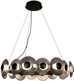 Металлический каркас черного матового цвета, закругленные фактурные плафоны разного диаметра из стекла дымчато-серого цвета, регулируемая высота, возможность использования универсальных креплений, LED-модуль.