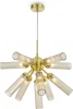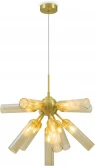 Арматура из металла, цвет — золото. Рельефные плафоны в тренде ZIGZAG. Материал — стекло, цвет — янтарный. Высота подвесных светильников регулируется. Плафоны закреплены на металлическую сферу. Источник света — лампа с цоколем G9.