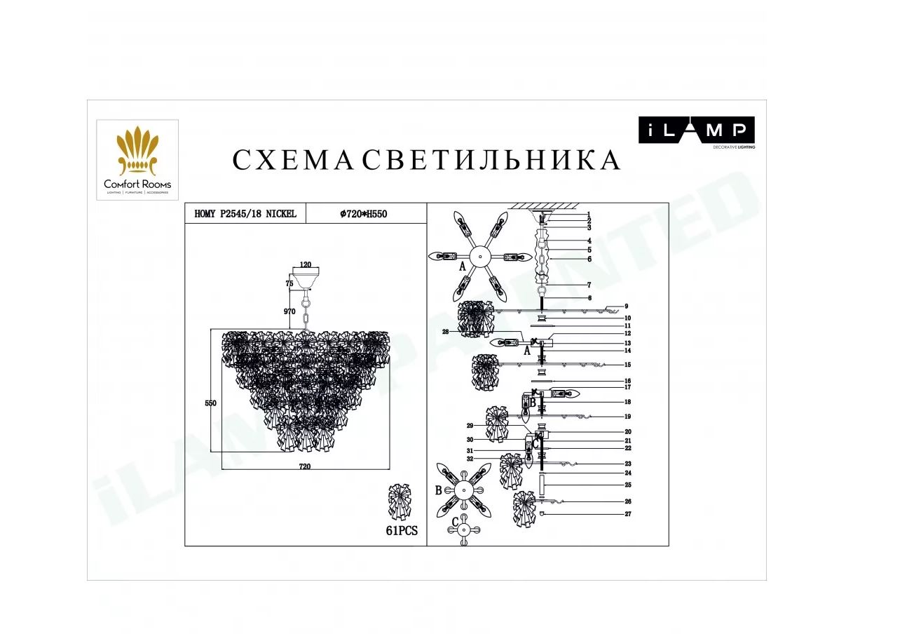 Подвесная люстра каскадная Homy P2545-18 NIC от российского бренда iLamp исполнена в цвете никель из металла и украшена декором из стекла. Модель имеет плафон из стекла и подходит для размещения на потолке в гостиной, спальне, кухне, кабинете в стиле модерн. Лампочки с цоколем 18xE14 имеют мощность 720W и освещают площадь до 36 кв. м. Напряжение питания 220V. Дополнительные опции: регулировка по высоте, возможность подключения диммера. Монтаж производится на металлический крюк. Диаметр — 720 мм. Заказывайте iLamp Homy P2545-18 NIC онлайн по низкой цене с гибкими условиями доставки на Fedomo.ru!