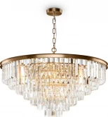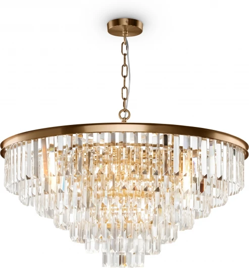 Арматура из металла в трех оттенках: латунь, хром, золото. Многоярусный декор. Подвески: прозрачное (арматура – хром, латунь) и янтарное (арматура – золото) стекло. Высота подвесных моделей регулируется.