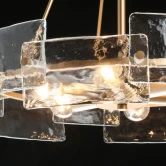 Металлическое основание гальванизировано в цвет золота. Подвесная люстра декорирована фактурными стеклянными пластинами, имитирующими вулканическое стекло.