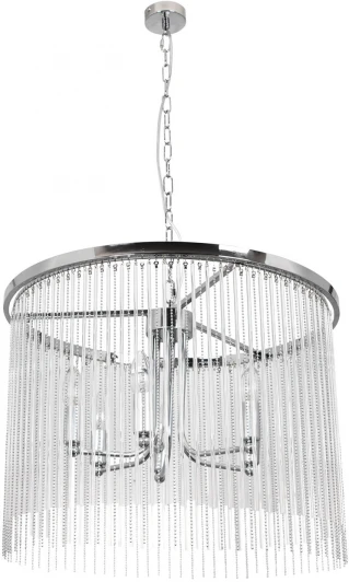 Металлическое основание подвесной люстры гальванизировано в цвет хрома. Светильник декорирован прозрачными стеклянными трубочками и металлическими цепочками, гальванизированными в цвет основания.