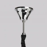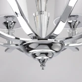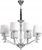 Металлическое основание светильника гальванизировано в цвет хрома. Двухслойные абажуры выполнены из текстиля белого цвета и термостойкого акрила. Подвесная люстра декорирована массивами из прозрачного хрусталя. 1 режим – Лампы накаливания