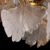 Металлическое основание подвесной люстры гальванизировано в цвет латуни. Светильник декорирован стеклянными пластинами матовыми и гальванизированными в цвет шампань и янтарь. Стеклянные пластины отлиты в форму в виде листьев.