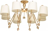 Металлическое основание подвесной люстры окрашено в цвет перламутрового золота. Заменяемые источники света закрыты текстильными абажурами бежевого цвета. С внутренней стороны текстиль защищен прозрачным термостойким акрилом. Абажуры отделаны кантами и прошиты. Люстра декорирована хрусталем, гальванизированным в цвет топаз.