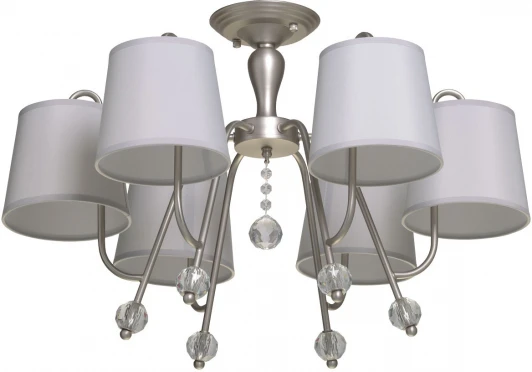 Металлическое основание подвесной люстры окрашено в цвет перламутрового серебра. Заменяемые источники света закрыты текстильными абажурами серого цвета. С внутренней стороны текстиль защищен прозрачным термостойким акрилом. Абажуры отделаны кантами и прошиты. Люстра декорирована прозрачным хрусталем.