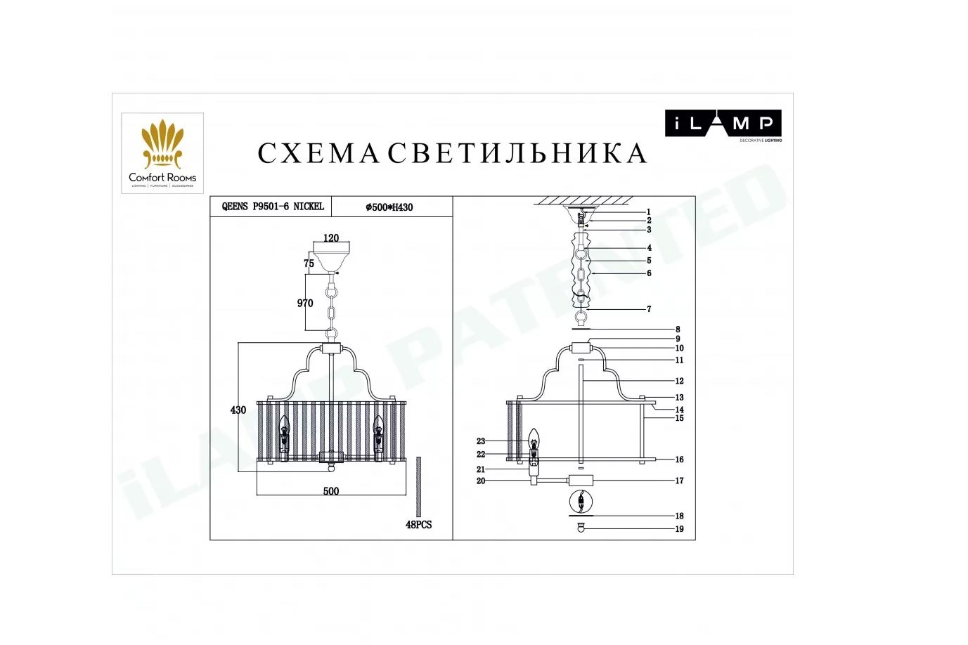 Подвесная люстра Qeens P9501-6 NIC от российского бренда iLamp исполнена в цвете никель из металла. Модель имеет плафон из стекла и подходит для размещения на потолке в гостиной, спальне, кухне, над обеденным столом, кабинете в стиле модерн. Лампочки с цоколем 6xE14 имеют мощность 240W и освещают площадь до 12 кв. м. Напряжение питания 220V. Дополнительные опции: регулировка по высоте, возможность подключения диммера. Монтаж производится на металлический крюк. Диаметр — 500 мм. Заказывайте iLamp Qeens P9501-6 NIC онлайн по низкой цене с гибкими условиями доставки на Fedomo.ru!