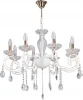 Металлическое основание подвесной люстры окрашено в белый цвет. Отдельные элементы основания гальванизированы в цвет золота. Декоративные розетки и декор центральной оси выполнены из прозрачного стекла. Люстра декорирована подвесками из прозрачного хрусталя.