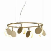 Коллекция выполнена в золотой отделке и доступна в нескольких размерах. Разные системы подвесок позволяют адаптировать светильник под задачи вашего интерьера. Самая большая трехъярусная композиция коллекции представляет собой три кольца разного диаметра с разным количеством светодиодов на каждом ярусе. <br />