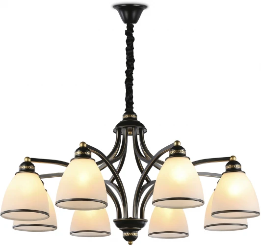 Потолочная люстра из коллекции TRADITIONAL. Модель TR3081 представлена в классическом стиле. Светильник выполнен из металлического каркаса черного цвета с золотыми вкраплениями и стеклянных матовых плафонов. Для данной модели подойдут лампы с цоколем Е27. Люстра будет прекрасным дополнением в любом помещении.