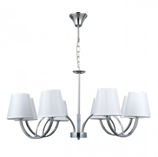 Металлическое основание подвесной люстры гальванизировано в цвет хрома. Люстра декорирована двухслойными текстильными абажурами белого цвета с термостойким акрилом внутри. Абажуры отделаны кантами сверху и снизу и прошиты.