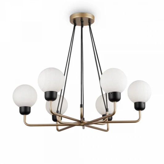 Легкость минимализма в сочетании с эстетикой постмодерна создает яркий и узнаваемый облик серии Venetti. Конструктивные особенности светильников, в частности, отсутствие центрального стержня, облегчают композицию, делая её компактной и невесомой. Арматура выполнена из металла золотого оттенка, а плафоны – из белого стекла. Их сферическая форма обеспечивает мягкое распределение светового потока, а модный рельефный рисунок добавляет дизайну индивидуальности. Серия включает подвесные люстры на 4 и 6 плафонов и предназначена для интерьеров в стиле лофт, mid-century modern, минимализм.