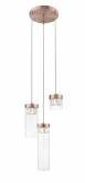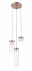 Подвес на круглом основании из металла цвета античная латунь, прозрачными проводами и тремя узкоцилиндрическими плафонами из прозрачного стекла с хрустальными элементами внутри. 3хG9