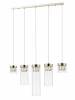 Подвес на планке из металла цвета матовое золото, прозрачными проводами и пятью узкоцилиндрическими плафонами из прозрачного стекла с хрустальными элементами внутри. 5хG9