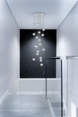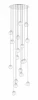 Подвес на круглом основании из металла цвета хром, с прозрачными проводами и двенадцатью стеклянными плафонами напоминающими небольшие прозрачные глыбы льда. D1220mm, H1100-5000mm, 18хG9