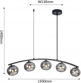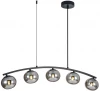 Дугообразный матового черного цвета, серые плафоны с зеркальной тонировкой из выдувного стекла, лампу G9 можно менять, часть каркаса фиксируется тросиком для баланса