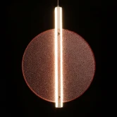 Металлическое основание подвеса гальванизировано в цвет никеля. Корпус плафона выполнен из сплава алюминия с цинком и гальванизирован в цвет основания. Светодиодные источники света закрыты матовым силиконом. Подвес декорирован фактурным стеклом, окрашенным в массе в розовый цвет.
